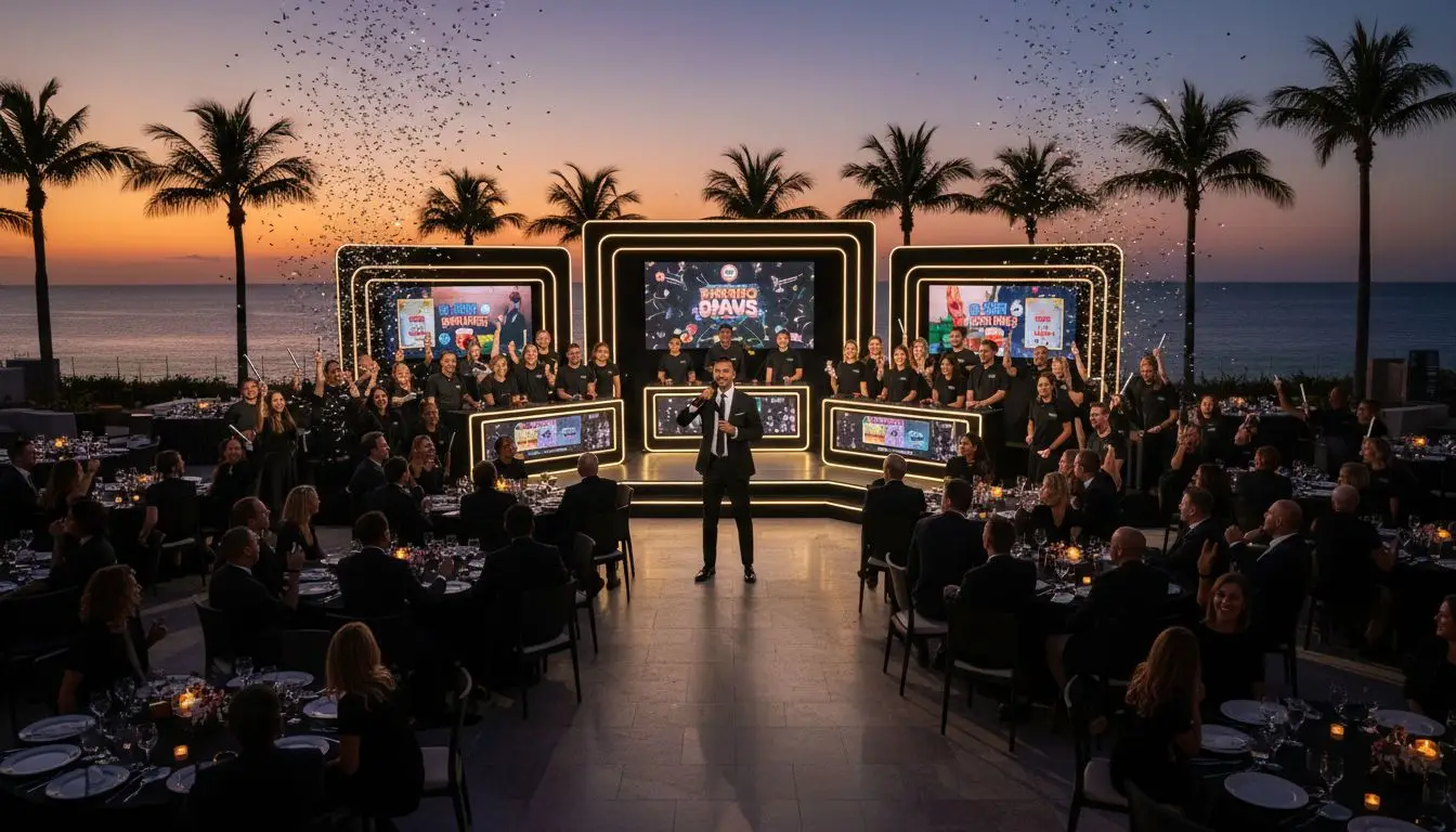 - Mid (50–250): $8,000–$25,000 — emcee, stage, enhanced AV, bespoke content, prizes.