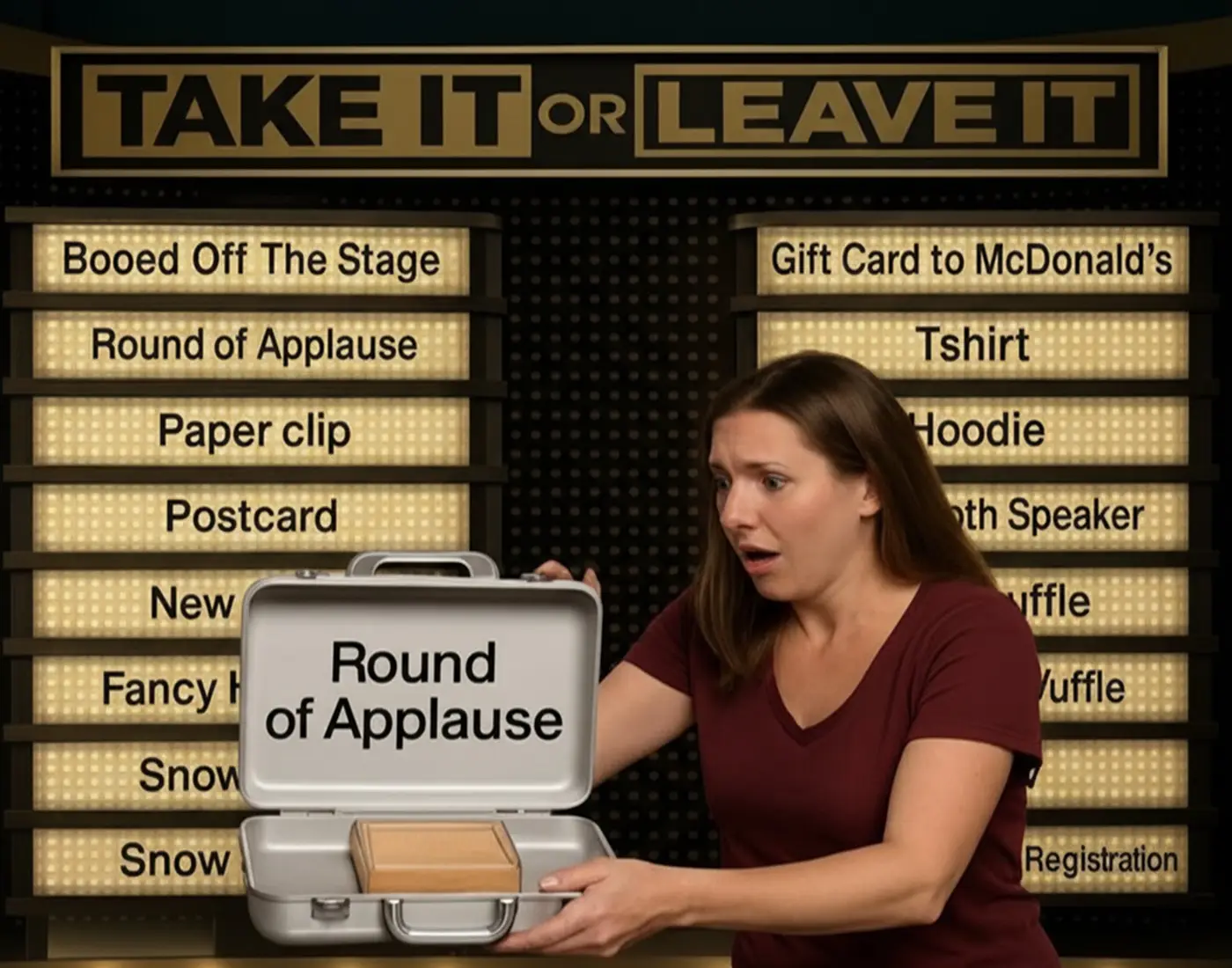 Take It or Leave It is our hilarious and customizable parody of the hit TV show *Deal or No Deal*, designed with 14 mystery cases, unexpected prizes, and plenty of dramatic tension. Contestants choose their case and eliminate others, hoping their pick holds the ultimate reward. But instead of cash, your prizes can be anything—gift cards, funny items, company swag, or even just bragging rights!